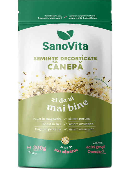 Semintele decorticate de canepa aduc organismului tau vitamine si minerale din cele mai importante, necesare pentru o buna functionare. Magneziul imbunatateste musculatura si sistemul nervos, fosforul sustine metabolismul si sistemul osos, de asemenea, ajuta la intretinerea membranelor celulare. Vitamina B3 te ajuta sa scapi de oboseala si contribuie la pastrarea unei pieli netede si sanatoase, iar calciul sustine, alaturi de fosfor, sanatatea oaselor.